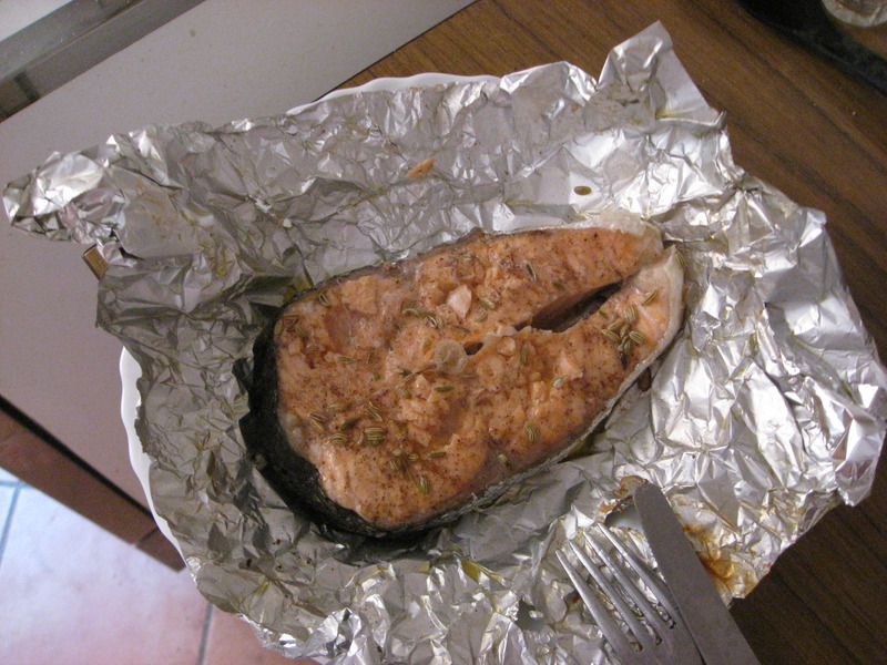 我其实不喜欢吃鱼,大概是因为刺多,做起来也麻烦的原因,所以第一次男朋友说他买了三文鱼,问我要不要一起吃的时候,我一口就回绝了,不过他再三推荐,我只好答应尝尝,结果一尝就爱上了。虽然后来也吃过几次三文鱼寿司和刺身,但不知道是不喜欢吃生鱼还是不喜欢味道,只有这种全熟锡箔纸煎三文鱼才是我的最爱,现在每个星期至少一次