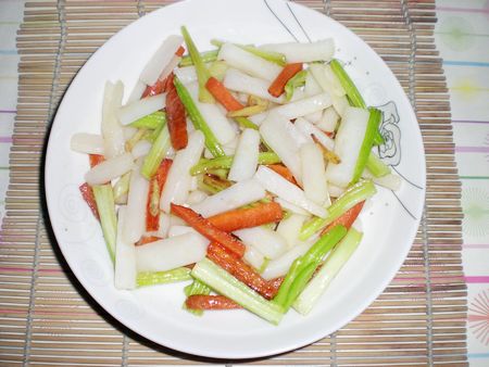 4、胡萝卜、西芹切条,姜切丝