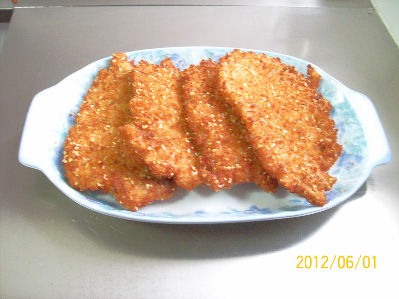 7、猪排粘粉方法:将浆汁好的(灌浆后猪排的厚度将会增加一倍左右)猪排,放入面包糠略晃动使其一个面充分沾满面包糠。