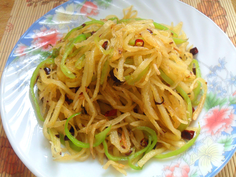 土豆的吃法最多见的就是家常炒土豆丝,其实偶尔把土豆在炒之前,用油炸成薯条状然后在炒,吃在嘴里的的土豆就会又脆又香,非常下饭。还有最近真够怪哉的,连续三次买青椒,都是非常的辣,在炒的时候把我呛的不行,吃完菜后嘴巴还都快变成香肠嘴了,ps:如果炒的时候再用上葱油会更好些。。。