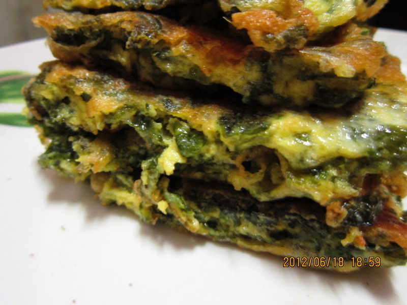 4、热锅,把油烧到七成热,倒入紫菜蛋糊,两面煎成金黄色即可