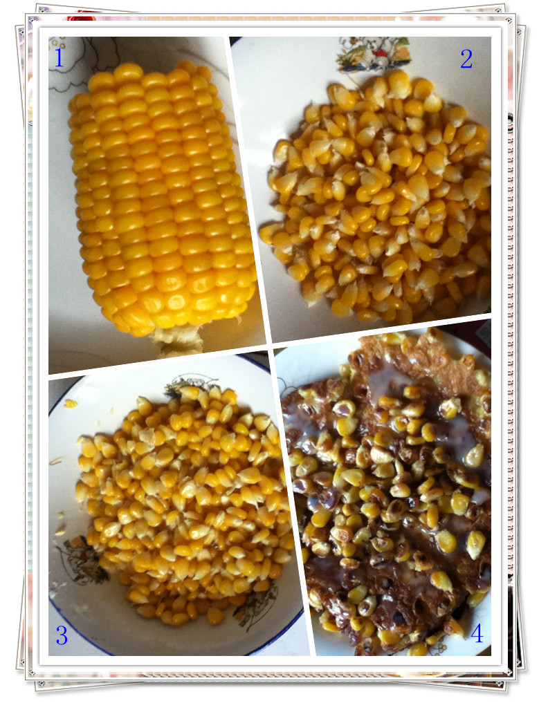 4、4、锅内下油,转小火,放入调好的玉米粒,用锅铲压平,时不时抖动平底锅,以免粘锅;差不多成形翻到另外一面,加入少许油,继续用锅铲压平,时不时抖动平底锅,以免粘锅。起锅,将炼奶挤在玉米烙上即可。