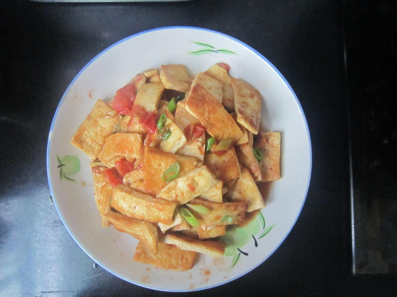 及以下步骤:把豆腐切成长方形薄片,电饼铛放入花生油,把豆腐两面煎黄 准备好食材 把豆腐切成长方形薄片,电饼铛放入花生油,把豆腐两面煎黄 准备好食材 把豆腐切成长方形薄片,电饼铛放入花生油,把豆腐两面煎黄 准备好食材 把豆腐切成长方形薄片,电饼铛放入花生油,把豆腐两面煎黄 西红柿切丁,炒锅内放油,放入葱白爆香,加入切好的西红柿丁儿翻炒,加一点水 加入豆腐翻炒片刻,放入盐,味极鲜,少许耗油炒匀即可 放上葱花,盛盘