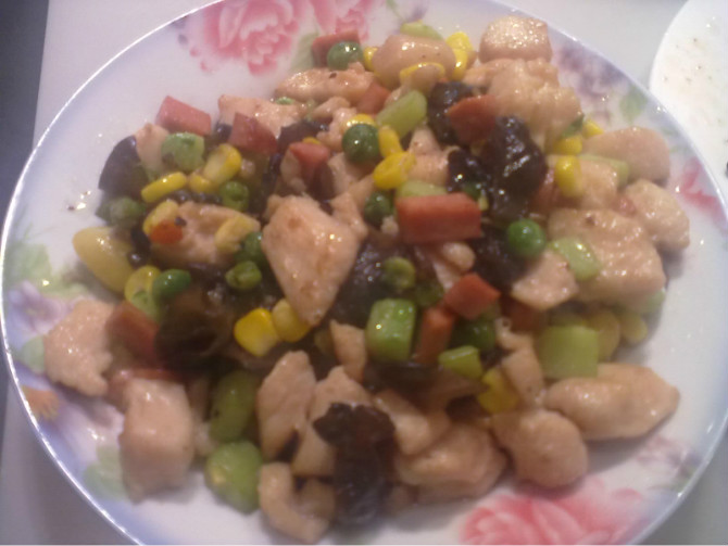 及以下步骤:准备好材料,把黄瓜和火腿切粒,黑木耳撕成小片 黑木耳提前用水泡发好~ 准备好材料,把黄瓜和火腿切粒,黑木耳撕成小片 黑木耳提前用水泡发好~ 准备好材料,把黄瓜和火腿切粒,黑木耳撕成小片 黑木耳提前用水泡发好~ 准备好材料,把黄瓜和火腿切粒,黑木耳撕成小片 锅里热油,先将里脊肉倒入翻炒~~ 再倒入所有杂蔬~~加入少量盐,黄酒,继续翻炒~~ 把青豆玉米炒熟即可