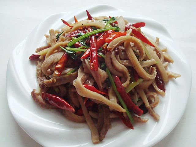 羊肚一定的清洗干净,去掉内膜,不可久炒,大火翻炒,这道爆炒羊肚是香辣味的,一般做这道菜就得香辣