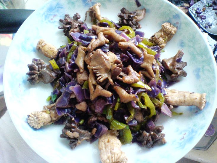 紫甘蓝:含有丰富的维生素c、v和较多的维生素e和b族。每100克食用部分含蛋白质1.4克,脂肪0.1克,糖3.3克,钙57毫克,磷42毫克,铁0.7毫克。用于炒食、煮食、凉拌、配色,具有特殊的香气和风味。 鸡杂:鸡肠、鸡珍、鸡心、鸡蛋袋子。 今天这个菜,算是废物利用吧,紫甘蓝是提取色素煮过的,鸡杂是节后剩下的,但这道菜是很好的下饭菜哦,哈哈!~
