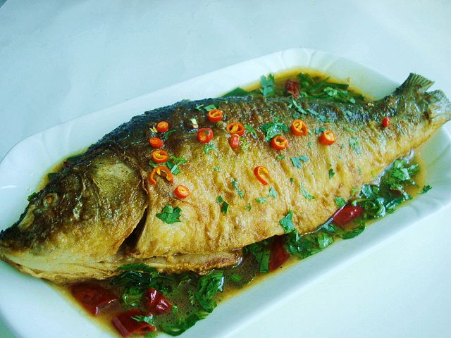 1、材料:贵妃鱼 小葱姜 盐 白糖 酱油 鸡精 干红辣椒 香菜 料酒 植物油