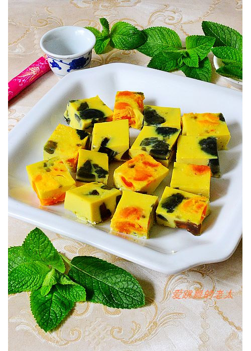 及以下步骤:再把咸蛋黄与皮蛋放入 用保鲜膜封住,中火隔水蒸8--10分钟。 凉凉,即可切块装盘 把咸蛋黄捞出,咸蛋白放入鸡蛋液,加1调羹料酒,2调羹清水打匀 咸蛋黄与皮蛋分别夹成小块 取一个比较深的盘,四边用油抹好 把蛋液倒入 再把咸蛋黄与皮蛋放入 用保鲜膜封住,中火隔水蒸8--10分钟。 凉凉,即可切块装盘