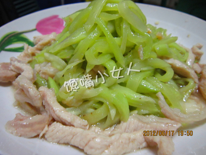 及以下步骤:莴笋切丝,加点盐,将盘子斜放,将水份渗透出来 将肉切丝,用一点水淀粉和料酒淹制蒜头拍一下,切碎 莴笋切丝,加点盐,将盘子斜放,将水份渗透出来 将肉切丝,用一点水淀粉和料酒淹制蒜头拍一下,切碎 莴笋切丝,加点盐,将盘子斜放,将水份渗透出来 将肉切丝,用一点水淀粉和料酒淹制蒜头拍一下,切碎 炒锅开始加热,放油,将蒜头爆香 将淹好的肉丝在锅里滑一下,然后倒入莴笋丝,大火翻炒 转小火开始调味,加点盐(不要多入哦,刚才已经加过)和鸡精,开大火继续翻炒 调味后不用炒太久,就可以出锅咯