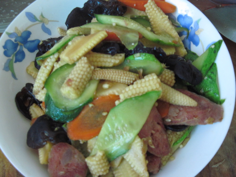 包米笋抄香肠,许配一点黄瓜,胡罗卜,木耳。
