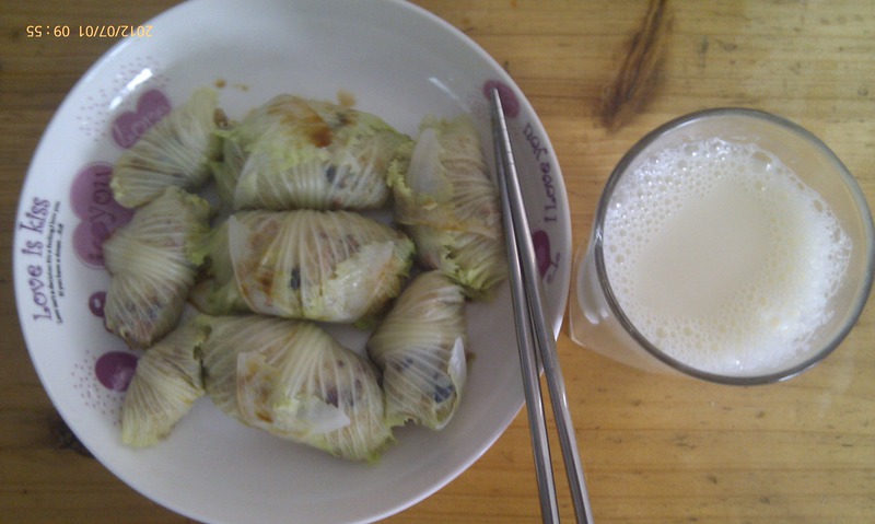 及以下步骤:配料炒熟后,倒入米饭,像炒饭一样翻炒,拌匀 这是炒好拌匀后的样子 开始包饭。把凉好的白菜叶子摊在碟上,放上米饭,根据叶子的大小放多少饭 把白菜捆起来,倒过来放,这是做好后的。用生菜包好看一些,生菜的叶子圆又大,也容易包。 包了7个,一些叶子太小,包的也小一些,烫菜的时候我没放盐,做好我在上面滴了点酱油,吃起来更有味道些 配上一杯豆浆,我早餐做好了,哈哈 再来一张,开餐喽 包了7个,一些叶子太小,包的也小一些,烫菜的时候我没放盐,做好我在上面滴了点酱油,吃起来更有味道些 配上一杯豆浆,我早餐做好了,哈哈 再来一张,开餐喽