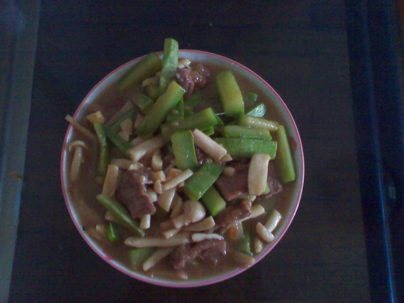 4.炒牛肉一定要快熟的时候才放茭瓜菌菇段,要不就把菜炒老了。