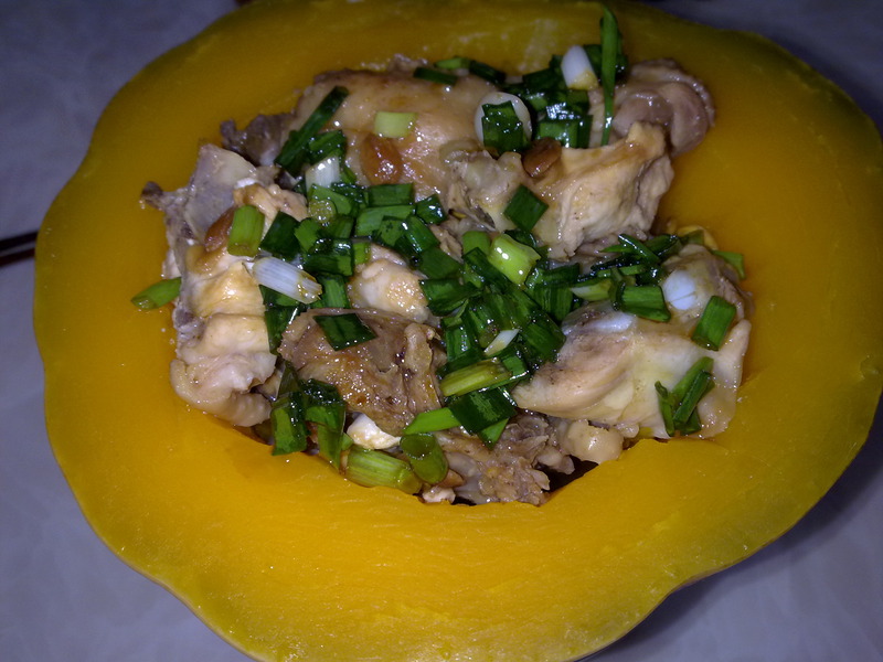 及以下步骤:用个碗(南瓜底部平的可以用盘子)装着南瓜放在蒸锅里蒸半个小时 葱花倒些酱油 热些花生油倒到葱花上,搅拌搅拌 捞起葱花淋到鸡肉上 南瓜洗净,把子和瓢掏干净 把鸡肉放到南瓜里面 用个碗(南瓜底部平的可以用盘子)装着南瓜放在蒸锅里蒸半个小时 葱花倒些酱油 热些花生油倒到葱花上,搅拌搅拌 捞起葱花淋到鸡肉上