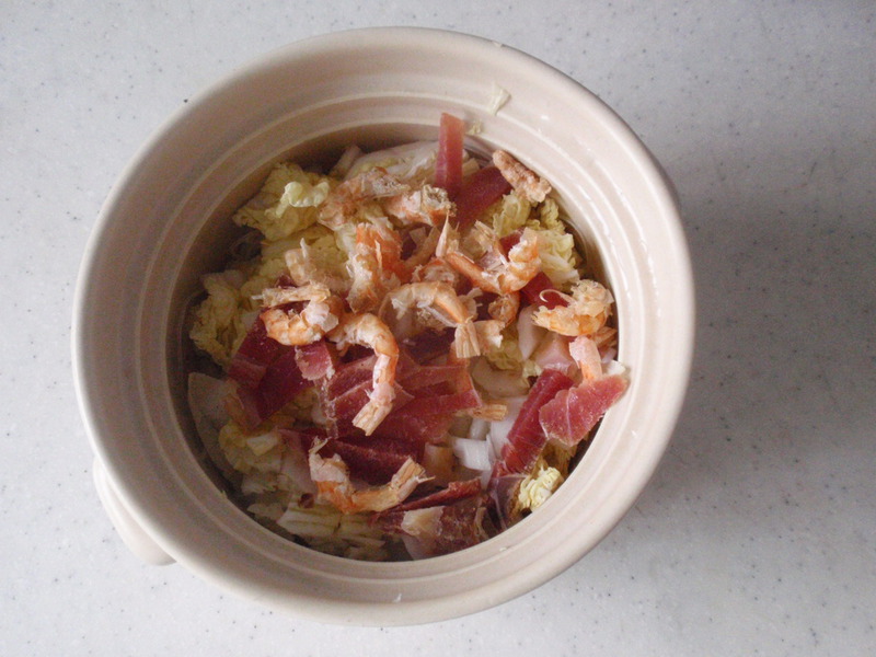 及以下步骤:上灶用中火烧开。 然后用小火炖会,关掉火。继续焖。 娃娃菜切碎,方便入味。 粉丝泡软 火腿切粗丝,开洋掰小段,方便味道出来 先放粉丝,再放娃娃菜 放上开洋和火腿 加点熬好的老汤。并加点水 上灶用中火烧开。 然后用小火炖会,关掉火。继续焖。