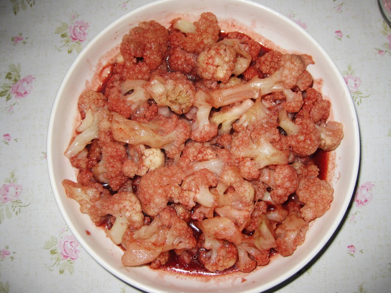 及以下步骤:在放入3大勺腐乳汁 烧至花菜均匀上色,剩少许汤汁即可 花菜掰成小朵 锅中放水,放入花菜 烧开,把花菜绰熟 放入清水过一下 沥干水分备用 热锅入油,放入花菜翻炒几下 在放入3大勺腐乳汁 烧至花菜均匀上色,剩少许汤汁即可
