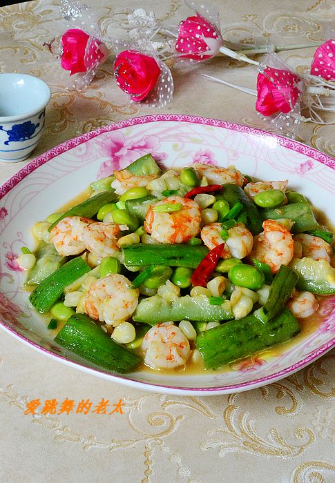 及以下步骤:玉米与毛豆用开水焯熟,捞出待用 锅里油热,放下姜,蒜,辣椒爆香,放入丝瓜煸炒 当丝瓜发蔫,放入毛豆,玉米粒 放入虾仁煸匀 加盐,料酒,胡椒粉,鲜抽煸匀 加水淀粉勾芡 撒些葱花即可 加盐,料酒,胡椒粉,鲜抽煸匀 加水淀粉勾芡 撒些葱花即可