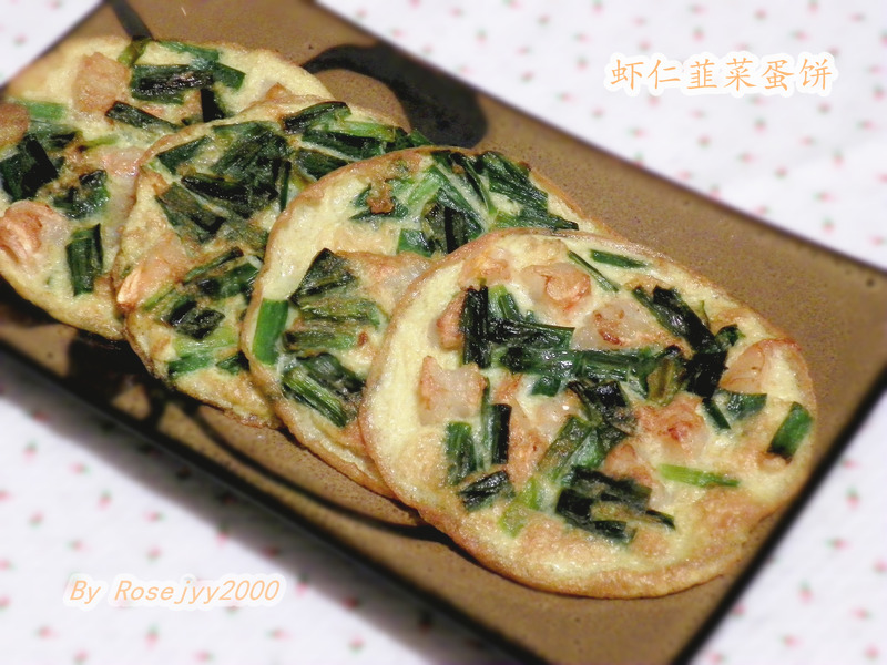 及以下步骤:鸡蛋打散,加水1汤匙、菜油1汤匙、料酒1茶匙,打至均匀,虾剥壳去线切成粒,并加盐1/4茶匙、胡椒粉1/4茶匙、料酒1/2茶匙腌渍,韮菜切成段; 韮菜虾仁都比较容易熟,所以不用预先烹调过,直接放入打好的蛋液里,搅拌几下; 鸡蛋打散,加水1汤匙、菜油1汤匙、料酒1茶匙,打至均匀,虾剥壳去线切成粒,并加盐1/4茶匙、胡椒粉1/4茶匙、料酒1/2茶匙腌渍,韮菜切成段; 韮菜虾仁都比较容易熟,所以不用预先烹调过,直接放入打好的蛋液里,搅拌几下; 鸡蛋打散,加水1汤匙、菜油1汤匙、料酒1茶匙,打至均匀,虾剥壳去线切成粒,并加盐1/4茶匙、胡椒粉1/4茶匙、料酒1/2茶匙腌渍,韮菜切成段; 韮菜虾仁都比较容易熟,所以不用预先烹调过,直接放入打好的蛋液里,搅拌几下; 鸡蛋打散,加水1汤匙、菜油1汤匙、料酒1茶匙,打至均匀,虾剥壳去线切成粒,并加盐1/4茶匙、胡椒粉1/4茶匙、料酒1/2茶匙腌渍,韮菜切成段; 韮菜虾仁都比较容易熟,所以不用预先烹调过,直接放入打好的蛋液里,搅拌几下; 用迷你锅煎,先起中火,底部及边缘涂少许油,用勺子均匀的倒入蛋液,将蛋仁铺好,再拿起锅转至蛋液均匀,煎至金黄色,基本熟,如果不用迷你锅,用普通平底锅也十分好,这次煎是为造型可爱些,也使迷你锅发发市; 用筷子或胶锅铲轻轻的掀起蛋块,翻转来煎另一面至金黄色。