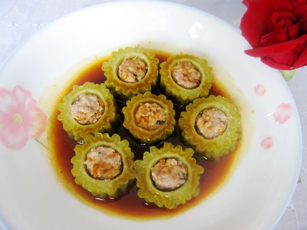 及以下步骤:处理好的苦瓜排盘,入蒸锅蒸15分钟左右至熟 五香粉、香油、酱油充分混合 锅内烧热油,倒入混合好的调味汁,烧开 将调味汁浇在蒸好的苦瓜上 用小勺挖去苦瓜籽 将肉馅逐个镶入苦瓜中 处理好的苦瓜排盘,入蒸锅蒸15分钟左右至熟 五香粉、香油、酱油充分混合 锅内烧热油,倒入混合好的调味汁,烧开 将调味汁浇在蒸好的苦瓜上