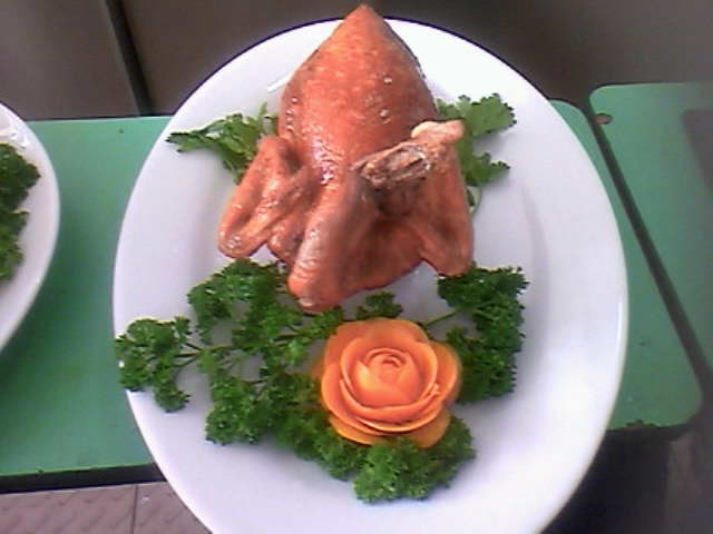 5、油下锅烧五成热.一手拿鸡吊起在锅内一手拿勺子把油淋在鸡身上,淋到金黄色即可。自己调个味碟就好