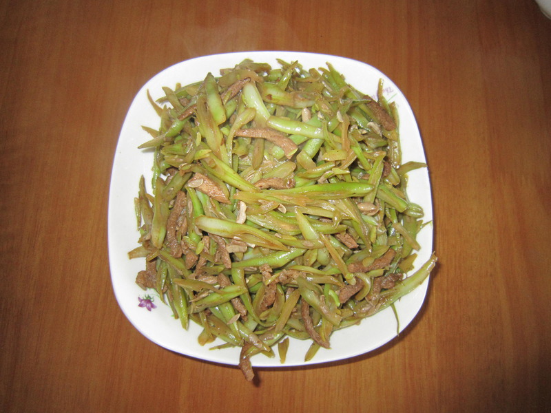 1、芸豆洗净如图切好备用,肉切丝,葱切段