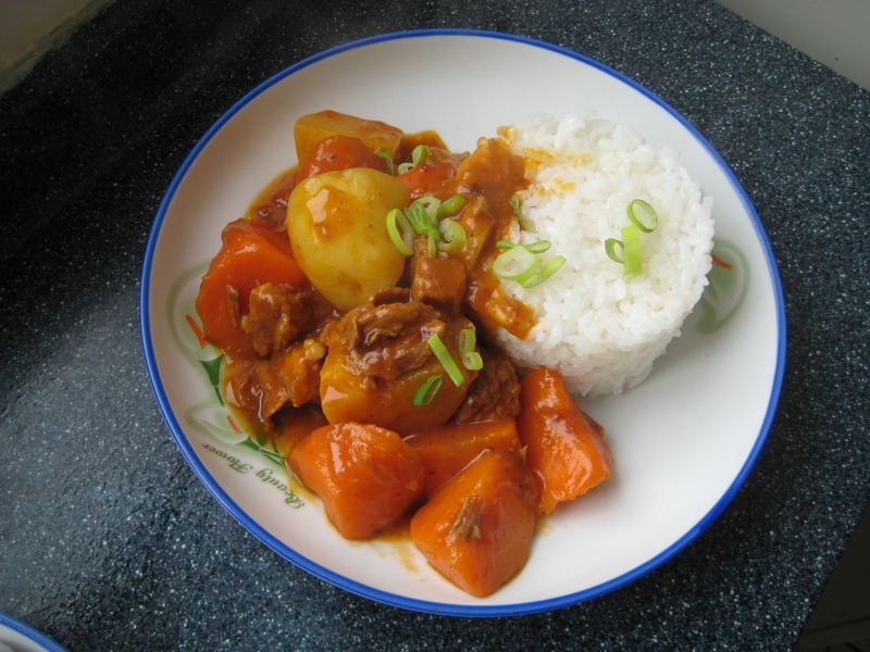 夏天吃饭容易没胃口,咖喱、蕃茄酱是不错的调味品。 周末做了一次咖喱土豆牛肉,加了些蕃茄酱。米饭再来个造型,菜一出锅直接浇上去,一人一盘,直接分餐制了,呵呵。
