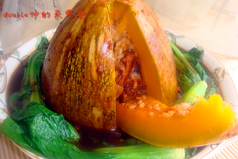 及以下步骤:扣入盘中四周摆上烫好的青菜。 锅中倒入红烧肉汁子勾芡浇上汁子。 取半个南瓜中间掏空。 糯米泡2小时以上,泡透。 先在南瓜底部铺上一层糯米。 再铺上红烧肉和适量南瓜丁。 最好用糯米压实铺满。 保鲜膜包上大火蒸45分钟左右。 扣入盘中四周摆上烫好的青菜。 锅中倒入红烧肉汁子勾芡浇上汁子。