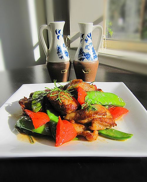 及以下步骤:倒入调好的酱汁,再放少许盐后略焖片刻。 加入洗摘好的荷兰豆。 翻炒均匀。 最后放少许香菜,即可熄火。 煎至两边焦黄。 把切成小块的红椒放入一起炒。 倒入调好的酱汁,再放少许盐后略焖片刻。 加入洗摘好的荷兰豆。 翻炒均匀。 最后放少许香菜,即可熄火。