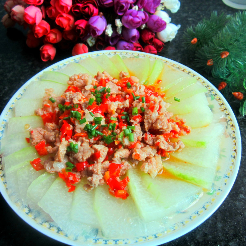 冬瓜可以说是餐桌上的常客,无论是炒,煮还是煲汤,都少不了它的身影。女性朋友们更是喜欢,冬瓜热量低不含脂肪,可以说是瘦身的家常菜首选之一。冬瓜中富含丙醇二酸。能有效控制体内的糖类转化为脂肪,防止体内脂肪堆积,还能把肥胖多余的脂肪消耗掉,有良好的减肥效果。 食材: 冬瓜1斤,辣椒2个,瘦肉200克, 精盐,老抽,味精,糖。 方法: 1、辣椒切丁,瘦肉切末,冬瓜切片。 2、锅里放入清水烧开,倒进切好的冬瓜过开水也叫氽水,后捞出。 3、锅烧热放油,倒进辣椒丁炒香, 4、再倒进剁好的肉末翻炒后加盐。 5、再调入老抽炒匀,加入清水,适量的糖烧开。不吃甜的可不加糖。 6、再调入味精。 7、把氽水的冬瓜摆盘, 8、将炒好的肉末,浇在摆好盘的冬瓜上即成。