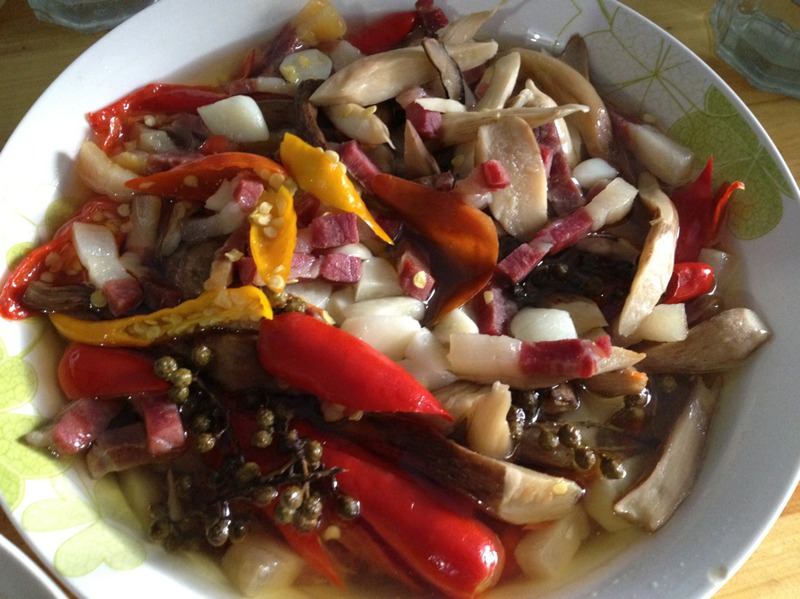 3、鸡枞切好,码放在碗里,然后是切好的大蒜,新鲜辣椒(辣椒最好是辣味足的),新鲜的花椒,这些都码放好以后,放上一勺猪油,然后就可以上锅蒸