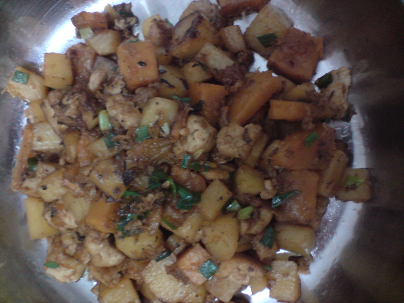 3、直接用刚才的油锅,将电磁炉调到900w,把南瓜土豆粒一起放进锅里炒,8分钟后将炸好的豆腐放进去继续炒,等南瓜和土豆都熟时把葱和调料一起放进去,翻炒一下即可上锅。