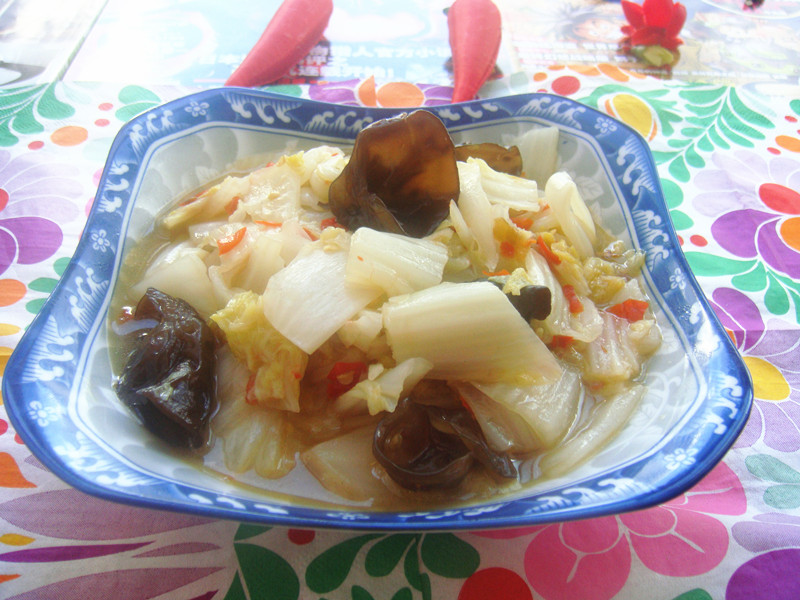 及以下步骤:再加入黑木耳再一次烧开1分钟,加鸡精好了 白菜切成小块,洗净 泡发后的黑木耳洗净 白菜切成小块,洗净 泡发后的黑木耳洗净 剁椒酱 锅内倒油,待油锅热时倒进白菜煸炒至白菜出水。 再加盐,剁椒,盐要比平时少一些,剁椒也有盐分 加入适量的水后盖上大火烧开 再加入黑木耳再一次烧开1分钟,加鸡精好了