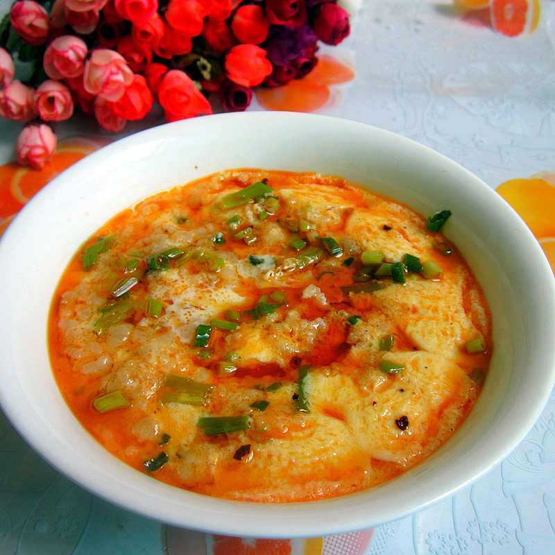 食材: 鸡蛋3个,肉末适量,葱花适量, 调料; 红油,精盐, 方法: 1、鸡蛋打入碗中搅散, 2、倒进红油搅匀, 3、再倒进肉末,加盐精盐搅散, 4、加入适量的清水搅均匀,撒上葱花。 5、放进蒸笼里蒸8分钟,冷却后即成。