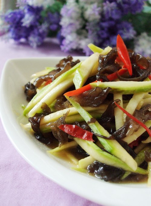 西葫芦 :富含水分,有润泽肌肤的作用,调节人体代谢,具有减肥、抗癌防癌的功效。 木 耳 :具有润肺止咳;抗凝血;降压;抗癌;洗肠,润肠,减肥的功效。 二样食材都很便宜,也容易买到,做法也简单哦。