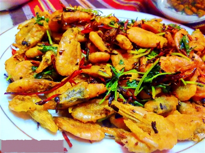 7、1.河虾剪净须足,洗净后擦干水分,拌入适量淀粉,用热油炸酥后捞出;