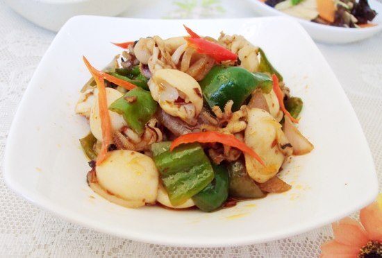 及以下步骤:放入一勺料酒、一勺豆豉去腥、增香翻炒2分钟 放入青椒片合炒。 放入糖、盐、味精拌均匀即可 姜蒜切片,辣椒切细段 锅中烧水,把墨鱼仔在开水里氽烫一下。 起油锅,5成热时先放入姜蒜、辣椒煸香,然后放洋葱翻炒片刻 放入目鱼仔翻炒。 放入一勺料酒、一勺豆豉去腥、增香翻炒2分钟 放入青椒片合炒。 放入糖、盐、味精拌均匀即可