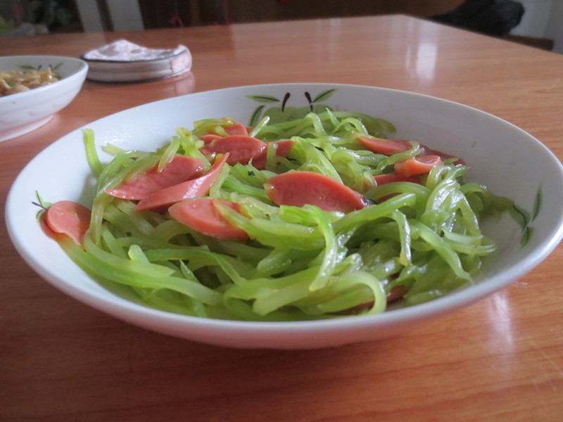 莴笋含钾量较高,有利于促进排尿,减少对心房的压力,对高血压和心脏病患者极为有益。含有少量的碘元素,它对人的基础代谢,心智和体格发育甚至情绪调划都有重大影响。因此莴笋具有镇静作用,经常食用有助于消除紧张,帮助睡眠。不同于一般蔬菜的是它含有非常丰富的氟元素,可参与牙和骨的生长。能改善消化系统和肝脏功能。刺激消化液的分泌,促进食欲,有助于抵御风湿性疾病和痛风。 鸣鸣喜欢吃香肠,刚好中午只炒