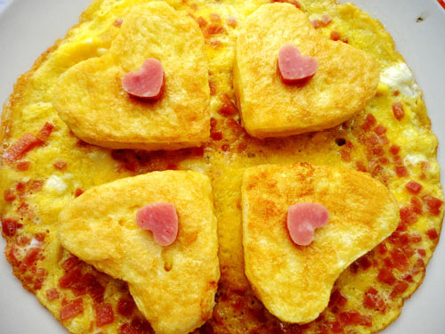 及以下步骤:7.平底锅加入倒入适量的食用油... 8.将切好的心形馒头过蛋液中过一下放入锅双面煎出浅焦黄待用。注:馒头不要在蛋液中泡时间过长,那样馒头容易变形... 9.将剩下浸泡馒头的火腿蛋液倒入平底锅中煎成蛋饼,这个只能煎一面噢所以火不能放太大,当蛋饼底略有定型时把刚煎好的心形馒头摆放在蛋饼上,小火煎至蛋饼完全成形即出锅了... 3.馒头片上放个心型片沿边切成心形备用... 4.鸡蛋三个打入碗中备用... 5.将火腿切成小丁粒... 6.将火腿丁放入蛋碗中加放适量的食盐搅拌均匀... 7.平底锅加入倒入适量的食用油... 8.将切好的心形馒头过蛋液中过一下放入锅双面煎出浅焦黄待用。注:馒头不要在蛋液中泡时间过长,那样馒头容易变形... 9.将剩下浸泡馒头的火腿蛋液倒入平底锅中煎成蛋饼,这个只能煎一面噢所以火不能放太大,当蛋饼底略有定型时把刚煎好的心形馒头摆放在蛋饼上,小火煎至蛋饼完全成形即出锅了...