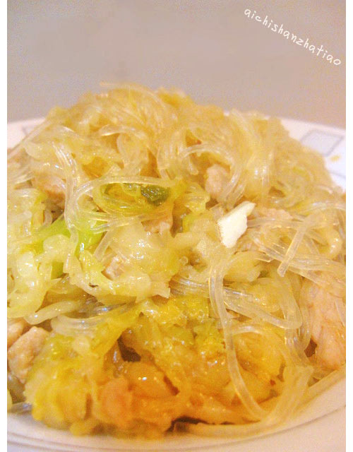 5、将焯好的粉丝入锅,加一碗水,没过粉丝即可。调入少量生抽、盐和糖调味。加盖焖3分钟左右,汤汁收干后大火翻炒即可。
