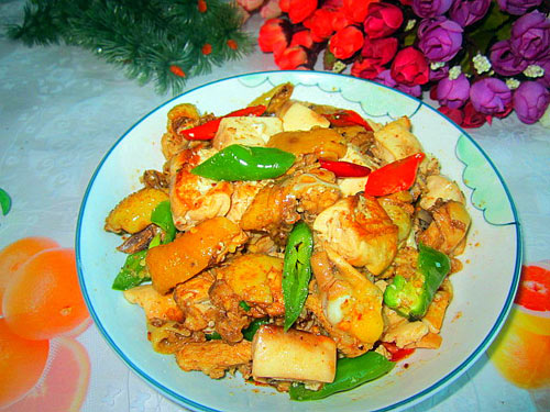 食材: 三黄鸡1只,豆腐250克切方块,青红辣椒适量, 调料: 盐,食用油,老抽,调味鲜,五香粉,味精,料酒。 方法: 1、取半只鸡切块, 2、锅里烧油放进红辣椒炒香后,下入切好的鸡块, 3、待炒干水分调入料酒去醒, 4、调入精盐炒匀后,调入老抽上色。把炒好的鸡撂入锅的一边,再倒进切好的豆腐油煎。 5、加盐把豆腐煎黄, 6、混炒,倒时辣椒翻炒, 7、再混炒,调入五香粉,调味鲜,味精。 8、翻炒均匀,调入适量的清水烧开即成。