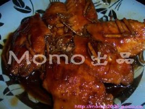 6.将热油滗出,留鸡翼在锅内煎至两面金黄色,下陈皮爆香,烹黄酒,倒入芡汁,加盖?至汤汁被吸干即可。