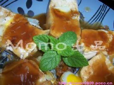 5.用蚝油、干贝汁、做成芡汁淋在豆腐上即可。