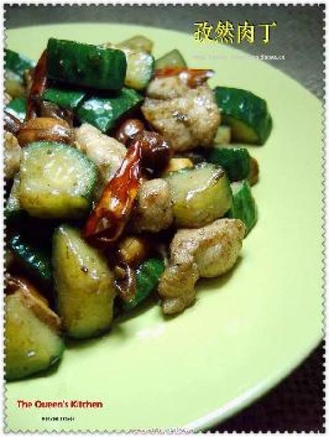 3.锅留下少许油,掰开干辣椒,少许蒜炸出香味,下黄瓜和少许料酒爆炒片刻后,肉丁花生加入一起翻炒,加入少许盐、鸡精、生抽一起翻炒,待快上锅时,撒上适量孜然粉、滴麻油、翻炒均匀即可装盘。