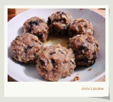 4.把马蹄粒、木耳粒和陈皮粒和牛肉碎混在一起,用手搓成圆形,摆到盆子上。