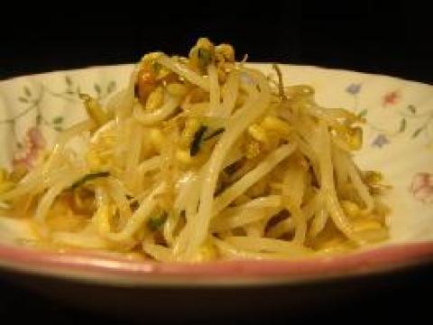 1.备锅水滚,下豆芽,韭菜川烫捞起备用.
