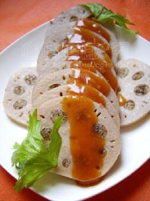 3.入蒸锅蒸50分钟,取出切片摆盘,蒸碗里的汤汁加番茄酱收干淋到藕夹上就ok了~
