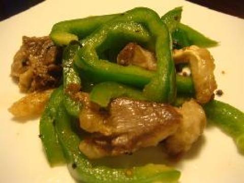 2、撒黑椒粒、孜然粉,半熟後,倒青椒丝,下酒呛锅。