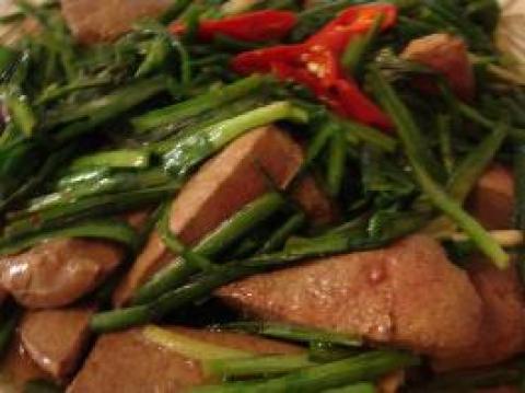 3.起油锅爆香葱白蒜末后,下韭菜.炒熟后,再下猪肝,倒入调味快速的拌炒下即成.