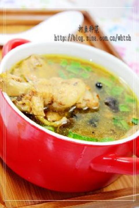 1.一个鸡骨架剁成小块,蘑菇泡好,洗干净。