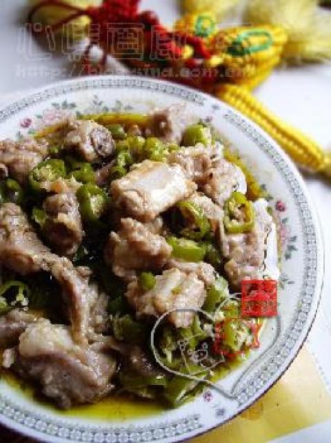 2.将青椒切小圈撒到腌好的排骨上,淋生茶油入蒸锅大火蒸15分钟,吃前撒少许鸡精拌匀就ok了!
