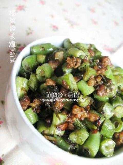 第一种:家常菜菜谱榄菜肉末爆芸豆做法